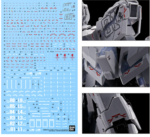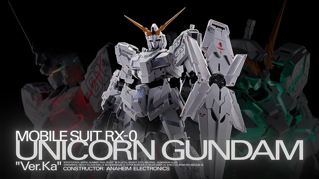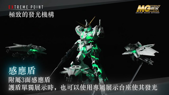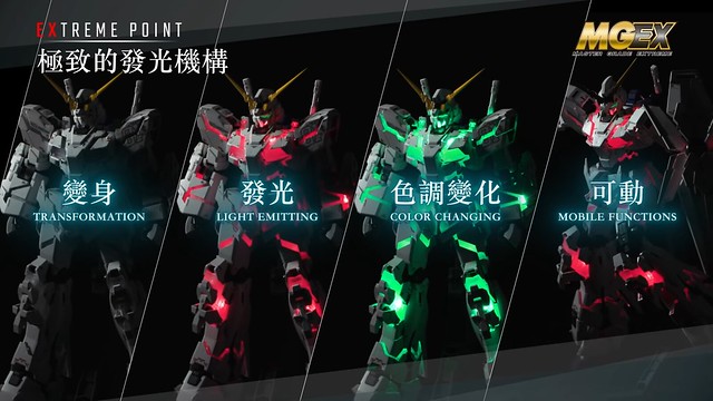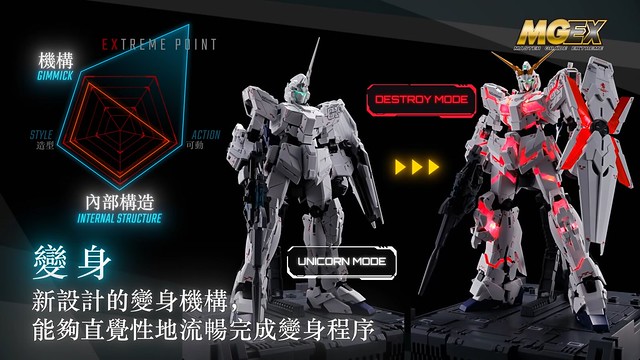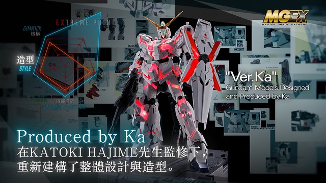 第一彈「MGEX 1/100 獨角獸鋼彈 Ver.Ka」本體採用新規造型製作,並由人氣機械設計師 Katoki Hajime 徹底監修,特色的「毀滅模式」變形機構經過重新設計,變形方式更加直觀、流暢。同時也附上新規設計的機身標誌水貼紙。