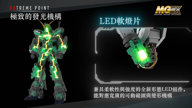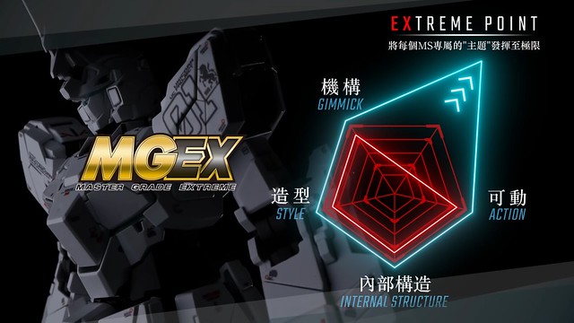 『MGEX(MASTER GRADE EXTREME)』系列是為紀念鋼普拉 40 週年而推出的全新商品,運用鋼普拉至今培育的技術、複合材質來表現各個機體所設定的主題,挑戰機動戰士的「極限表現」。相比一般『MG』商品投入更豪華的規格,價格也相對高昂。