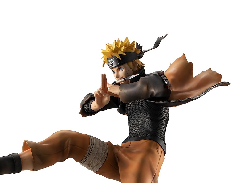 「G.E.M. 漩渦鳴人 忍界大戰 Ver.」PVC塗裝完成品,以忍界大戰中的鳴人為造型,尺寸全高約 26 公分。嘴上咬著苦無,雙手比出「影分身之術」的經典結印手勢,金黃色的刺蝟頭十分尖銳 (?) ,服裝的細節包括拉鍊、護額、破損的袖子與腿上的繃帶等,皆考究還原,腳高高踢起的姿勢也能清楚看見鞋底的紋路。內裡穿的鎖子甲以精緻的網格呈現,還能若隱若現看見胸肌與腹肌的肌肉線條!舊化的陰影塗裝效果使整體質感再提升!