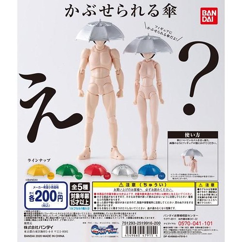 「頭戴式雨傘 傘帽」轉蛋,將傘帽微縮製作,讓你的玩具人偶在炎炎夏日也能戴上傘帽防曬遮雨!一共有五種款式,分別為五種不同的顏色:銀色、紅色、藍色、黃色、綠色,可以用來搭配不同的玩具配色~