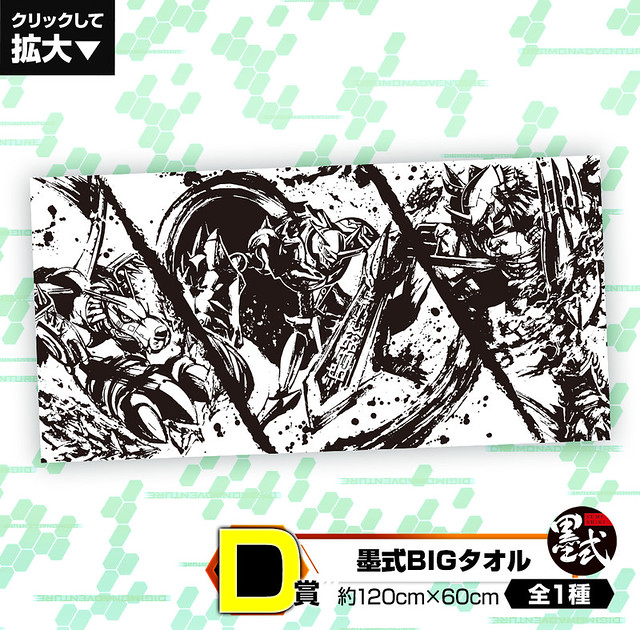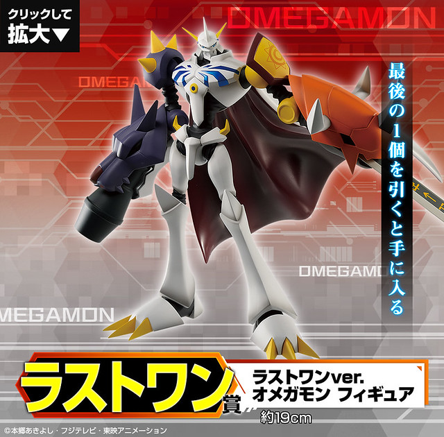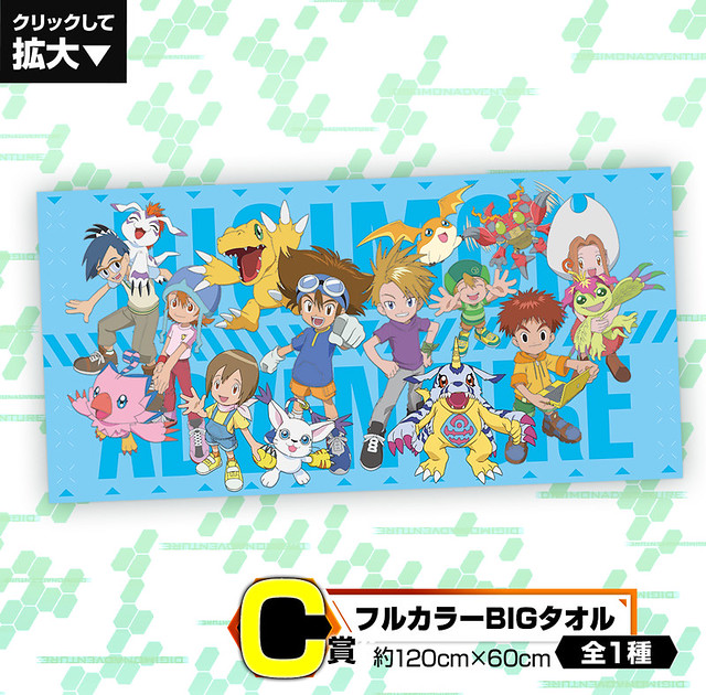 「一番賞 《數碼寶貝大冒險:》」的 A、B 賞兩款角色模型分別為 19 公分高的「奧米加獸」以及 15 公分高的「戰鬥暴龍獸」。其他獎項也相當豐富,包含有著數碼寶貝設計的大毛巾、橡膠吊飾...等生活用品,以及繪製出 8 位被選召孩子與搭檔數碼獸的精美插畫色紙,帶你回味最初的感動!