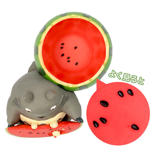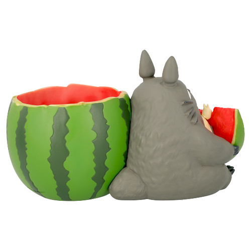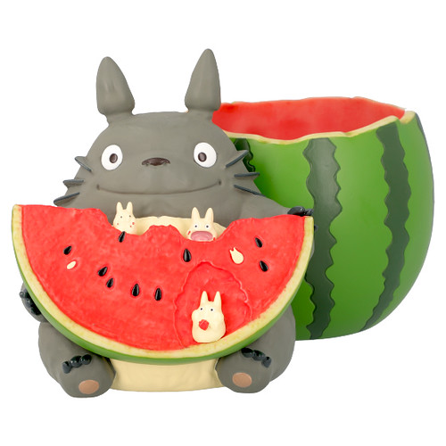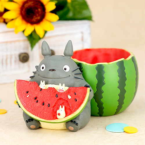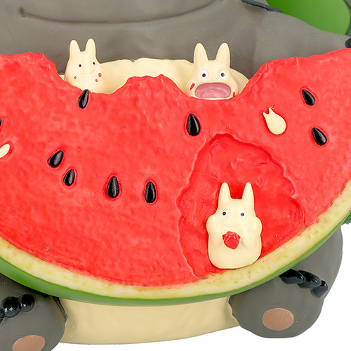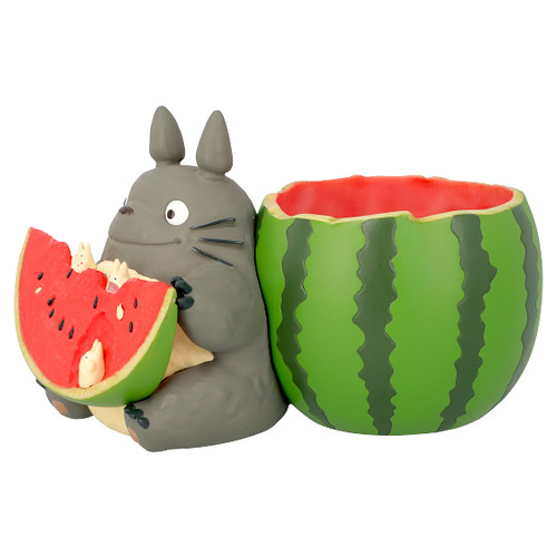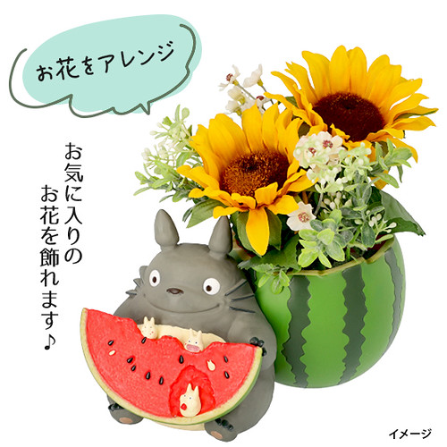 「龍貓吃西瓜花盆」,尺寸約高135mm,將大龍貓Totoro吃著西瓜的模樣立體化呈現,深後倚著被挖空的西瓜、手上拿著切片的西瓜,配色新明且相當具有夏日的氣氛!西瓜片上還有張著大口一起享用西瓜的小龍貓小白,實在是太萌啦!除了可以當作花器使用,也可以作為置物使用,擺飾起來相當討喜可愛~