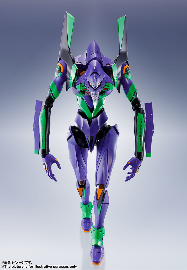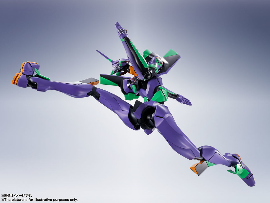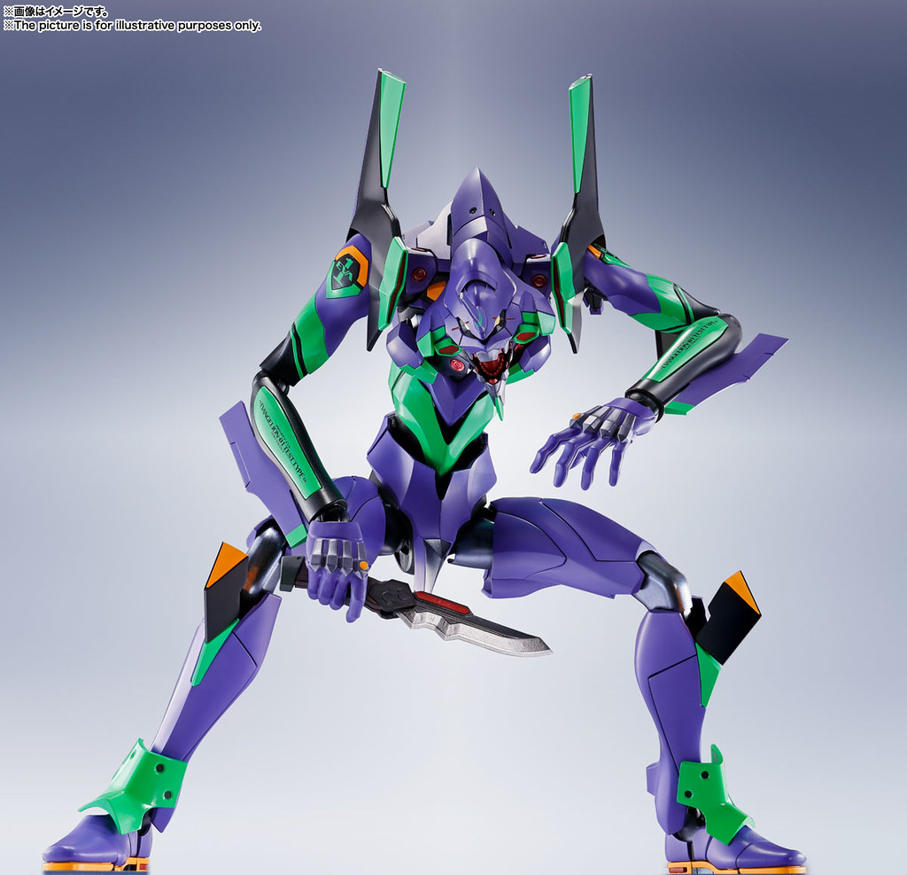 「DYNACTION 泛用人型決戰兵器 人造人 EVANGELION 初號機」擁有約 400mm 高的魄力尺寸,同時追求劇中的造型美,從口腔內部到外部裝甲(拘束器)細節皆有出色造型,並採用合金零件、POM材質構成的複合關節,讓巨大身軀獲得了靈活可動,能把玩各種張力十足的動作。相比新版 ROBOT 魂擁有壓倒性的尺寸與更豐富的機身標誌等細節。