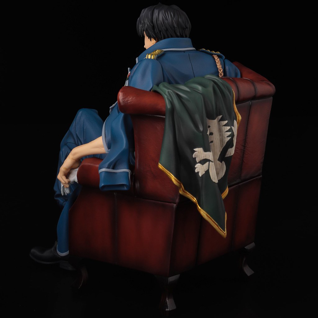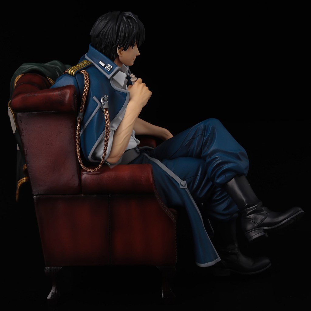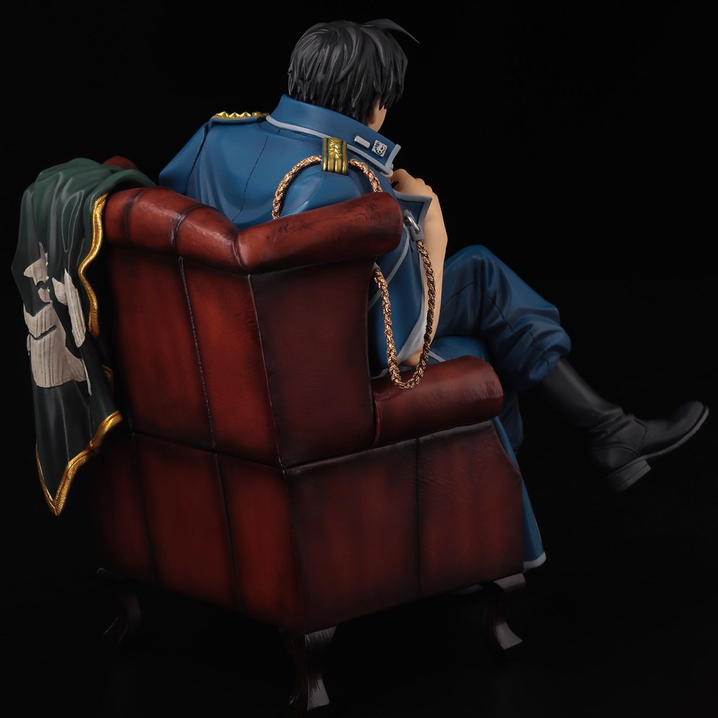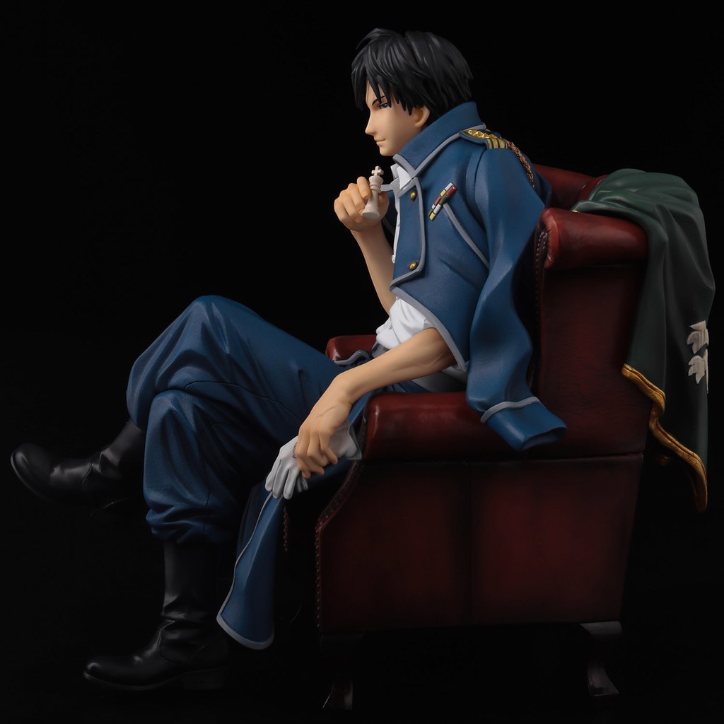 「羅伊‧馬斯坦古」1/8 比例 PVC 塗裝完成品,全高約 17 公分,以馬斯坦古坐在沙發椅上翹腳的成熟男人姿態呈現,沙發椅上披著軍旗,搭配上校帶有自信的表情透,似乎露出滿滿野心。將軍裝外套披在肩上,服飾上精緻的塗裝充滿質感,內裡的白襯衫包覆著結實的肌肉,手臂的線條與青筋讓整體更有魅力!附有可替換的嚴肅表情頭雕,手中的西洋棋、白手套與軍外套皆可以自由拆卸搭配,重新創建各種場景。