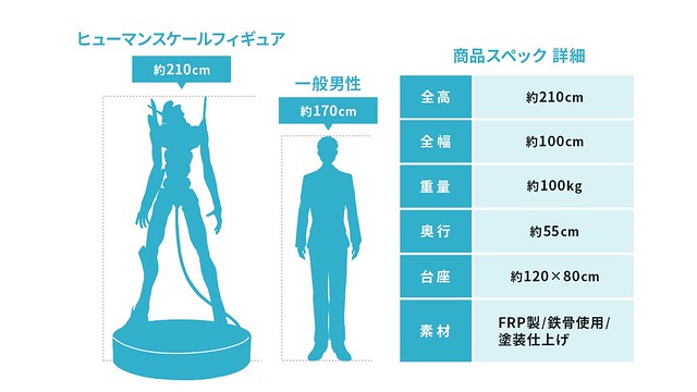 紀念商品「EVANGELION 初號機 HUMAN SCALE FIGURE」擁有 2.1 公尺高、100 公斤的驚人規格,本體依據展場中使用的初號機 3D 模型資料進行設計,使用 FRP 材質、鋼骨結構製作而成。除了魄力的本體外,更能加購臍帶電纜造型、長 5 公尺的 LED 燈套件,連結本體後即可讓初號機的雙眼發光。