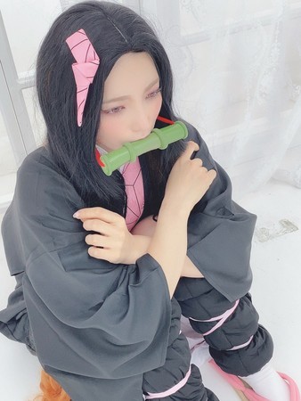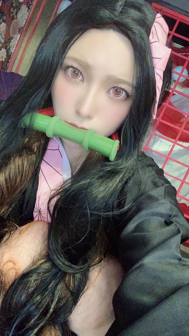 已經從ⒶⓋ界引退轉型 的上原亞衣扮成女主角「竈門禰豆子」,無辜獨坐姿態展露無口屬性,竹筒道具也實分注重「三竹節,紅綁帶」小細節,也模擬出鬼化的表準動作,霸氣又不失可愛。