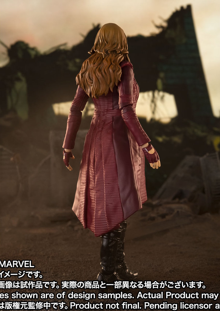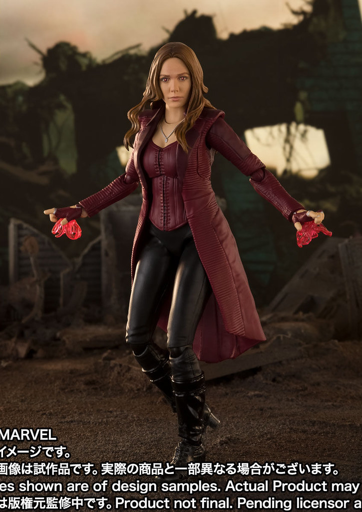「S.H.Figuarts 緋紅女巫(終局之戰ver.)」高約 15 公分,整體造型基本上與「無限之戰版本」相同,再現了勃艮第酒紅色的大衣、馬甲搭配黑色緊身褲、長靴,本作的亮點就在於憤怒與能量雙雙噴發時的「紅眼狀態頭雕」,還可以搭配交換用頭髮零件,但在特效件的部分只有一對,少了無限之戰版本中長型的直條造型特效,稍稍可惜了呀~