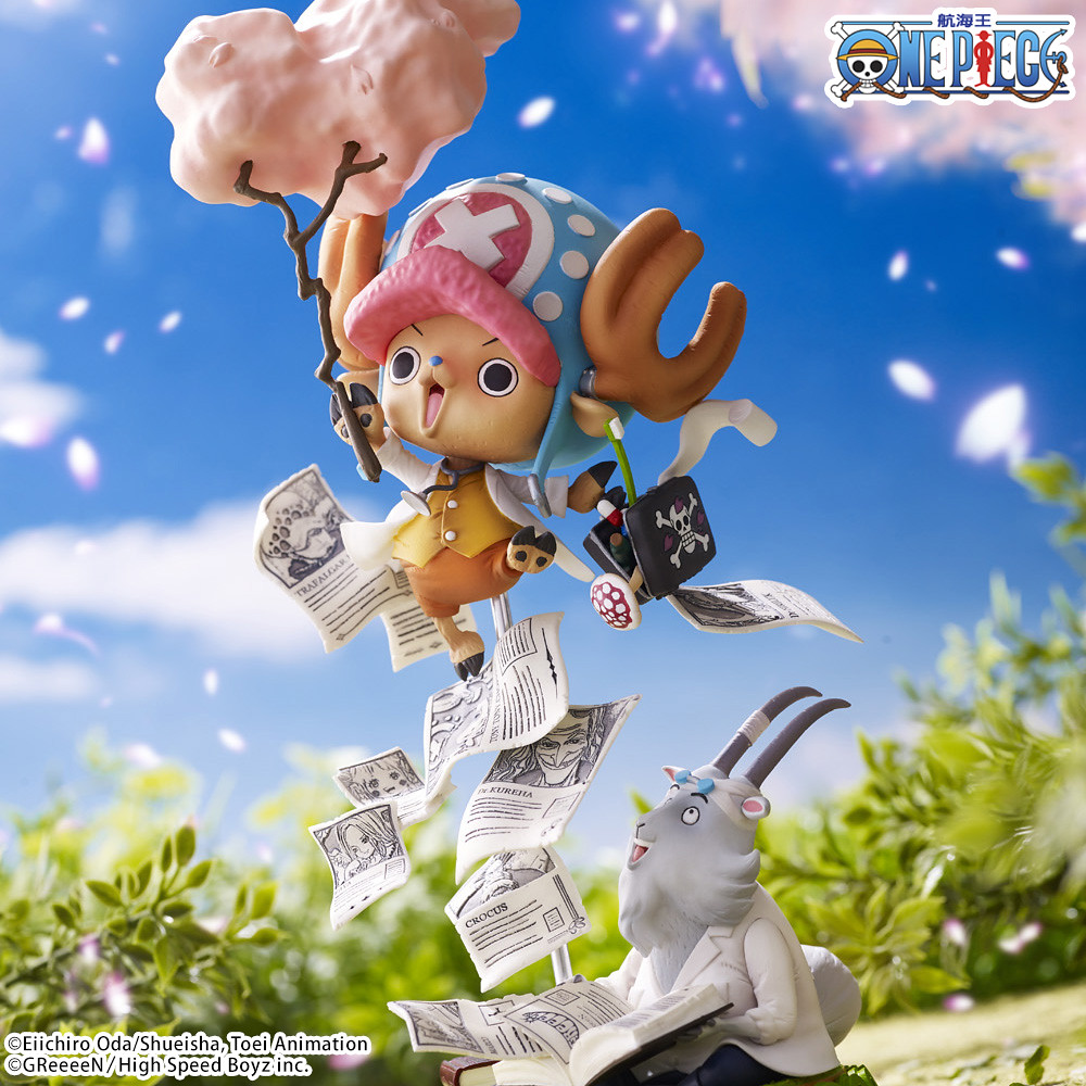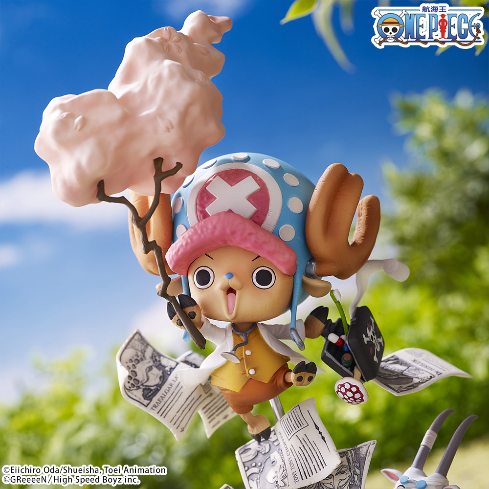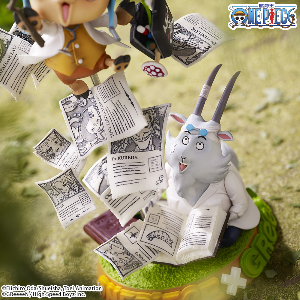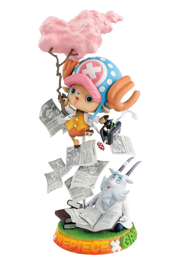 「One Piece Collaboration figure ~ Challenge from GReeeeN~」作品,原型師以豐富的經驗,設計出高水準的造型,完成 GReeeeN 夢想的模型。尺寸全高約 25 公分,以喬巴為主角,從羊醫生米牙基(ミヤギ)手中的書中充滿活力的向跳躍出來~手中拿著最愛的棉花糖,模樣相當可愛!腳下還散落飄揚著《航海王》中的醫生角色資料紙張,包含古蕾娃、羅等,讓整體充滿躍動感並且更加豐富。除了在底座有寫著『ONE PIECE』×「GReeeeN」的字樣,商品內也附有 GReeeeN 對喬巴模型完成品的留言卡~