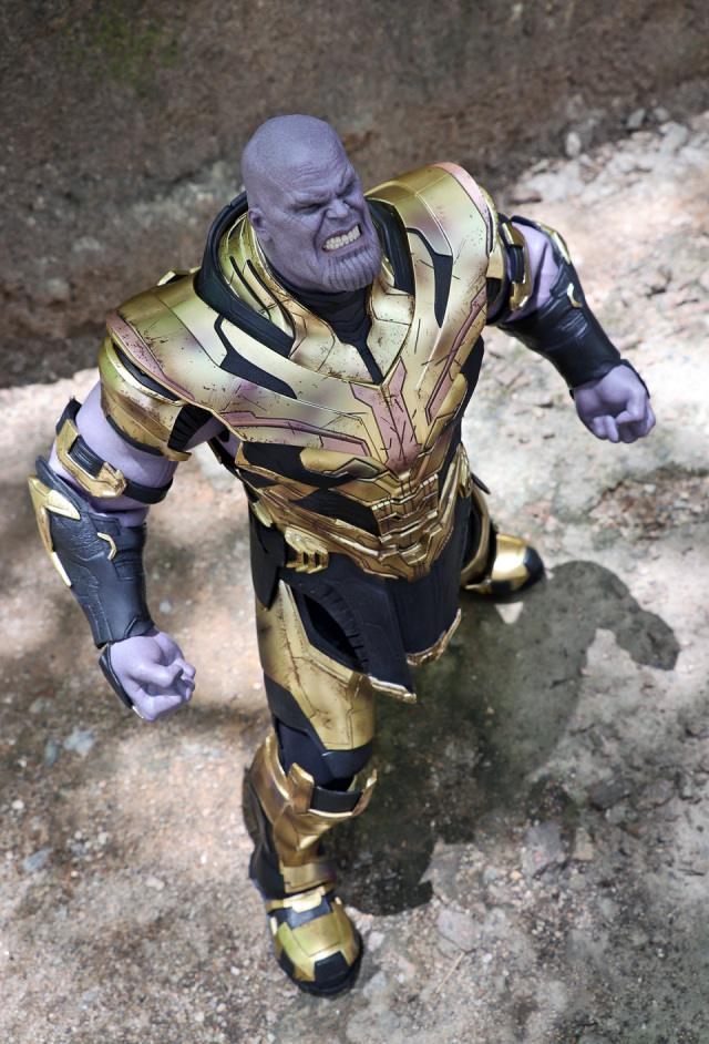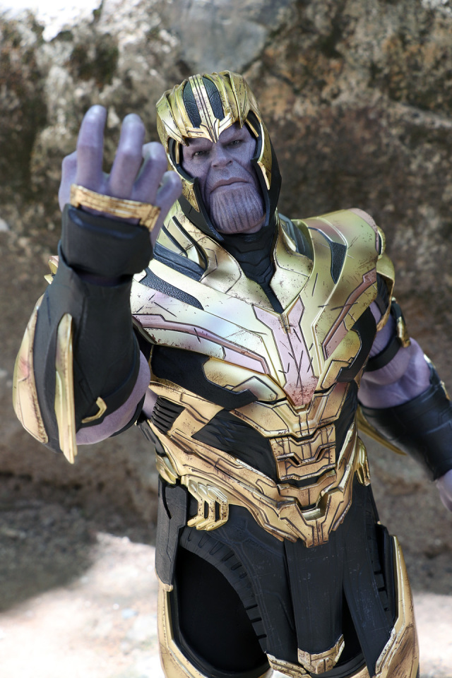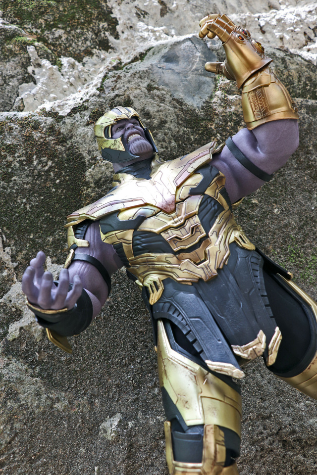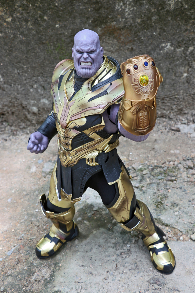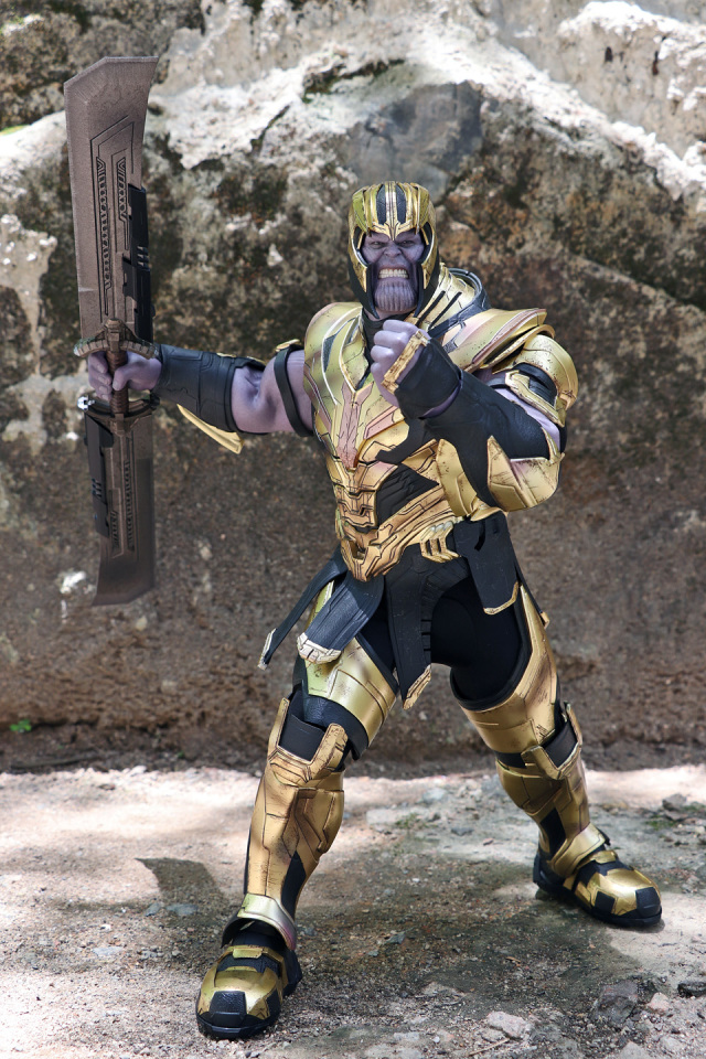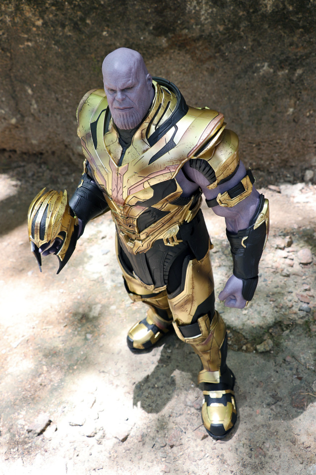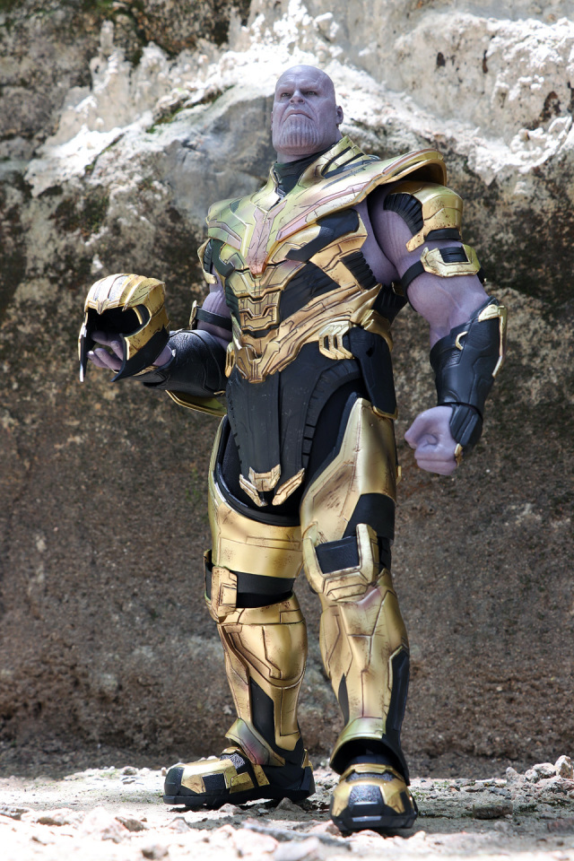 以 Hottoys 的人偶來說,這只是可動性較差的作品。雙臂、腰及大腿的可動性低,幸好關節卻滿緊的,沒有手軟腳軟的問題。玩具外型上很不錯,以劇中身披厚重戰甲的設定製作,整體外型及比例做得很好。包膠的雙臂粗壯及充滿肌肉感,戰損處理的盔甲及肌肉、皮膚等紋理亦非常細緻!著色及 QC 方面不俗,惟雙刃刀的長度像是短了一截...... 幸好可著燈的無限手套為他扳回不少分數。