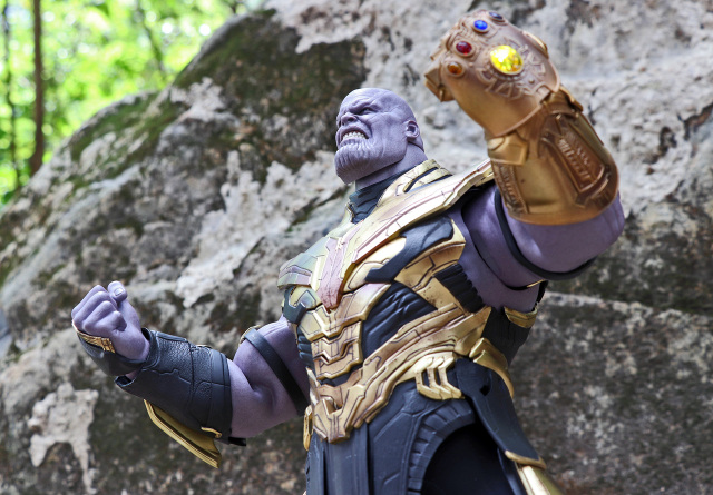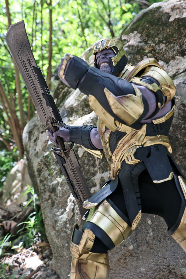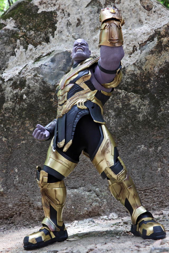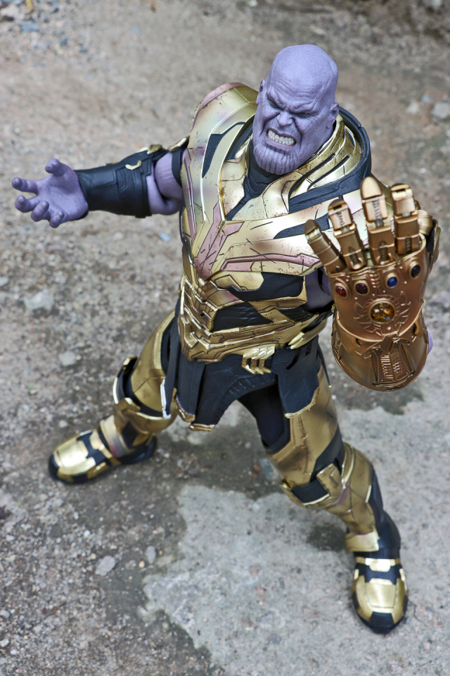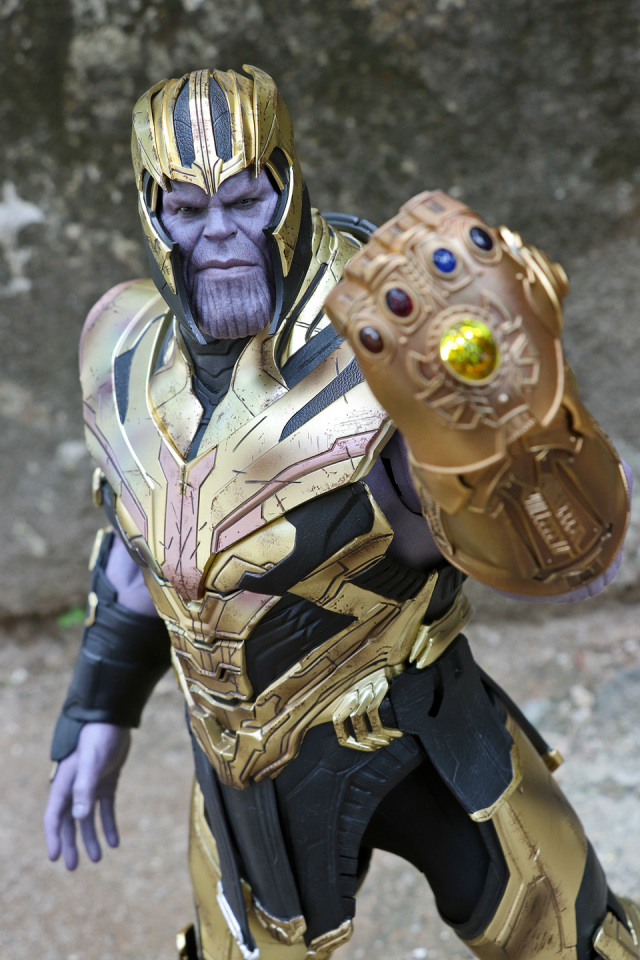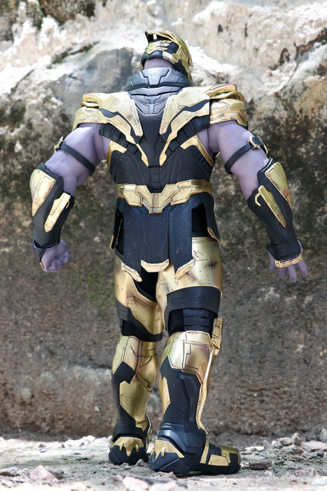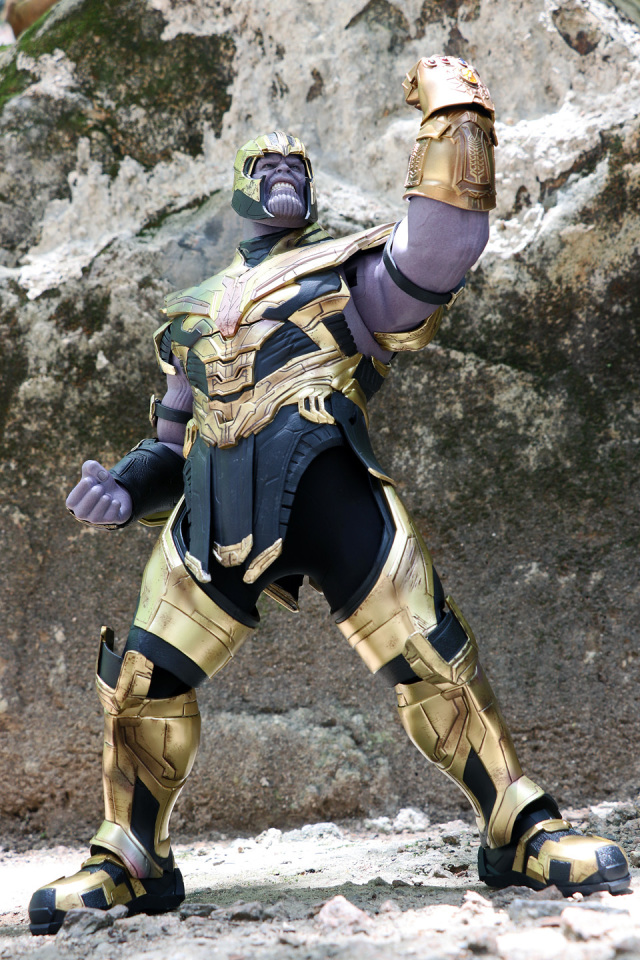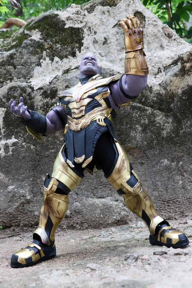 以 Hottoys 的人偶來說,這只是可動性較差的作品。雙臂、腰及大腿的可動性低,幸好關節卻滿緊的,沒有手軟腳軟的問題。玩具外型上很不錯,以劇中身披厚重戰甲的設定製作,整體外型及比例做得很好。包膠的雙臂粗壯及充滿肌肉感,戰損處理的盔甲及肌肉、皮膚等紋理亦非常細緻!著色及 QC 方面不俗,惟雙刃刀的長度像是短了一截...... 幸好可著燈的無限手套為他扳回不少分數。