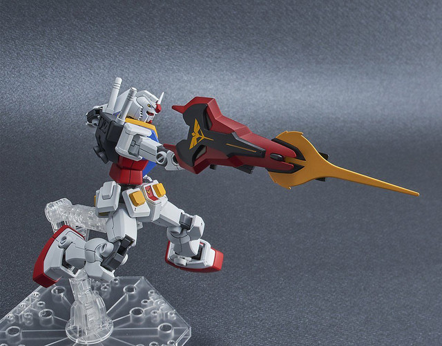 「SD鋼彈 EX-STANDARD 沙薩比」以系列特徵的三頭身比例、洗練裝甲造型製作這架夏亞總帥的名機,本體具備一定的可動性,並收錄光束散彈步槍、光束戰斧、盾牌等武裝,同時各武裝具備共通規格的 3mm 卡榫,能夠組合成原創型態、與 HG 系列模型連動。