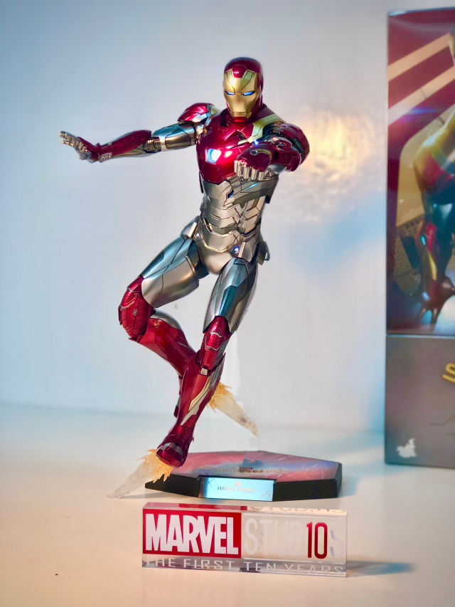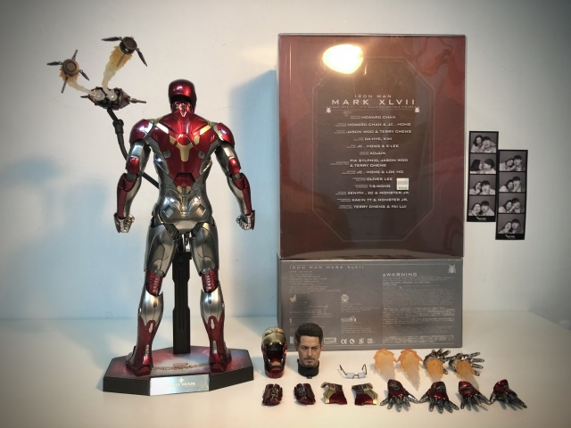 這次盒繪設計採用的是返校日電影美術圖,早期合金系列外盒都是向上抽取方式開箱,配件附上了5對手型/東尼頭雕/MK47空頭盔/墨鏡/火焰特效件/無人機發射器/2件噴射加速器/手臂飛彈替換件/肩膀飛彈替換件/地台。