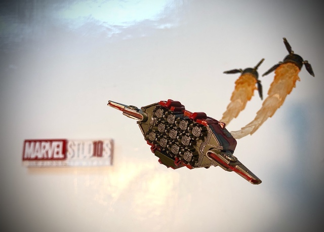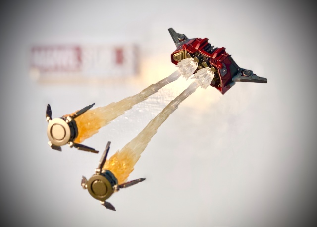 為了還原電影中畫面,這次有兩個比較特別的配件,分別是無人機發射器及空頭盔,無人機採用視覺遠近效果的比例來呈現,加速器上的爪還是可動的,而且附上了噴射的特效件,擺設起來畫面更加豐富,空頭盔也算是配件中的重點了,加上火焰特效件呈現飛行停留的感覺,打開面罩還原無人機操控的畫面。