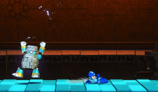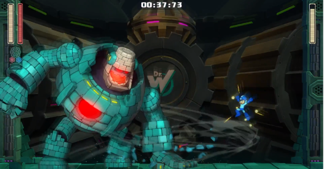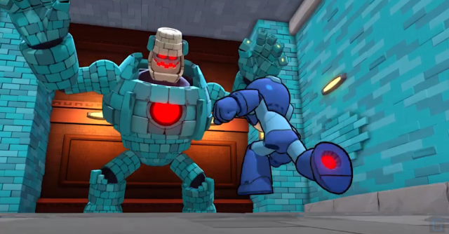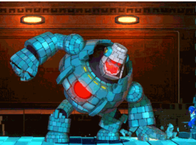 「洛克人11」 的磚塊人頭目,整個地形掉落都是他的主場,原本登場是小型砌牆機器人,打到一半就會從小型吸收變得有夠大隻,只能打中間紅色弱點。
