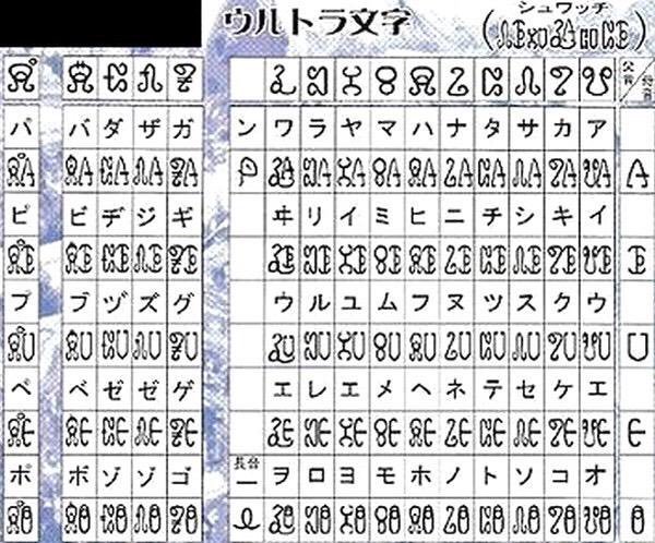 ▼奧特文字和日文五十音的對照表,不過解讀又是一大難題了