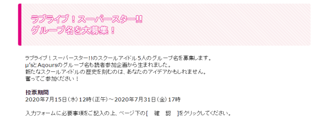 本月15日發行的《LoveLive!》綜合雜誌中,除了第三代消息外,也確定第四代《LoveLive! SuperStar!!》動畫製作,並於雜誌中發表關於團體名稱以及學校校徽投票的消息,總共兩個活動頁面。