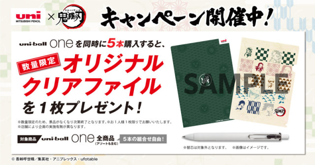 另外,實體店家櫃台活動的部分就是只要在書局購買「uni-ball one」這系列的原子筆 5 隻,去櫃台結帳就會贈送《鬼滅之刃》原創資料夾一張。這個活動將預定 7 月 27 日開始,直到贈品發送完畢為止。請自行注意前往的那家書局是否有這項活動,因為不是每家都會有,詳細情報請上官網查詢。