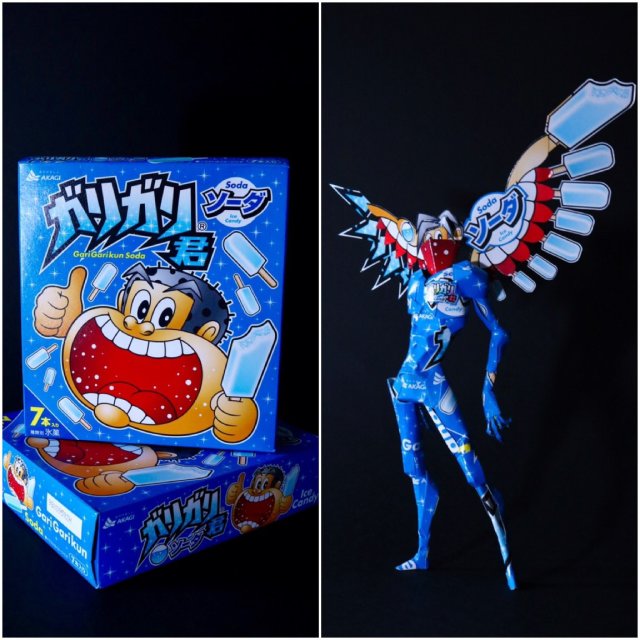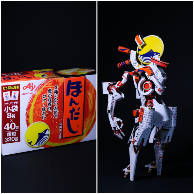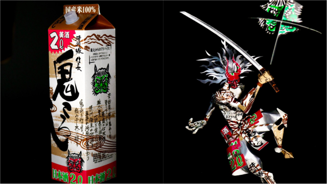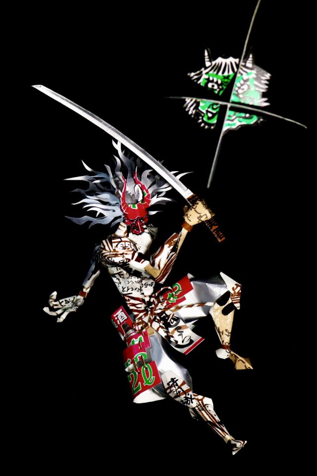 這隻武士是由空箱職人 はるきる(@02ESyRaez4VhR2l)所製作的,他利用盒裝日本酒「鬼ころし」的空飲料盒來進行加工剪裁,變成了一尊戴著貌似般若面具的狂氣武士,其精細度不仔細看還以為是塑膠或合金雕像啊,這身持刀殺鬼的樣子,其外表貌似也考慮到原本飲料盒的包裝設計,使武士的樣子看起來更加帥氣。