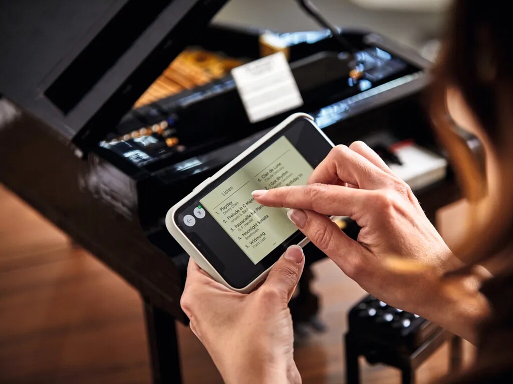 那麼,比原作(2798 件)多出的零件到底用在哪裡了呢?答案是重新設計、注入結合 Power Up 組件的琴鍵與內部構造,除了能像原始設計的那樣真實可彈奏、利用馬達讓鋼琴自己演奏之外,Power Up 的 APP 裡還收錄了包含《祝你生日快樂》、《我們祝你聖誕快樂》、貝多芬的《月光奏鳴曲》,以及 Donny Chen 創作的《Playday》......等曲目,所以在譜架上不只能放上《Playday》的樂譜印刷磚,還可以直接擺著手機、藉著手機播放樂曲來場迷你音樂會,令人驚豔!