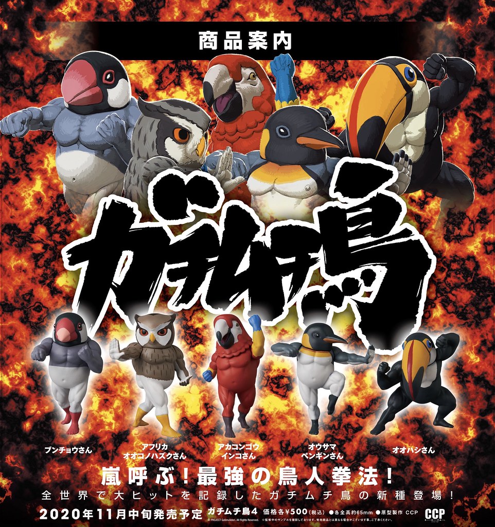 因惡搞套圖暴紅而推出轉蛋化商品的「千錘百鍊戰鬥筋肉鳥系列」(暫譯,ガチムチ鳥シリーズ)在大熱賣的第一彈與第二彈、第三彈後,日本 MEDICOM TOY 公司(株式会社メディコム・トイ)又將推出第四彈續作:「戰鬥筋肉鳥 4」轉蛋,一共有五款,參考售價為一轉 500 日幣,預計於 2020 年 11 月中旬發售。