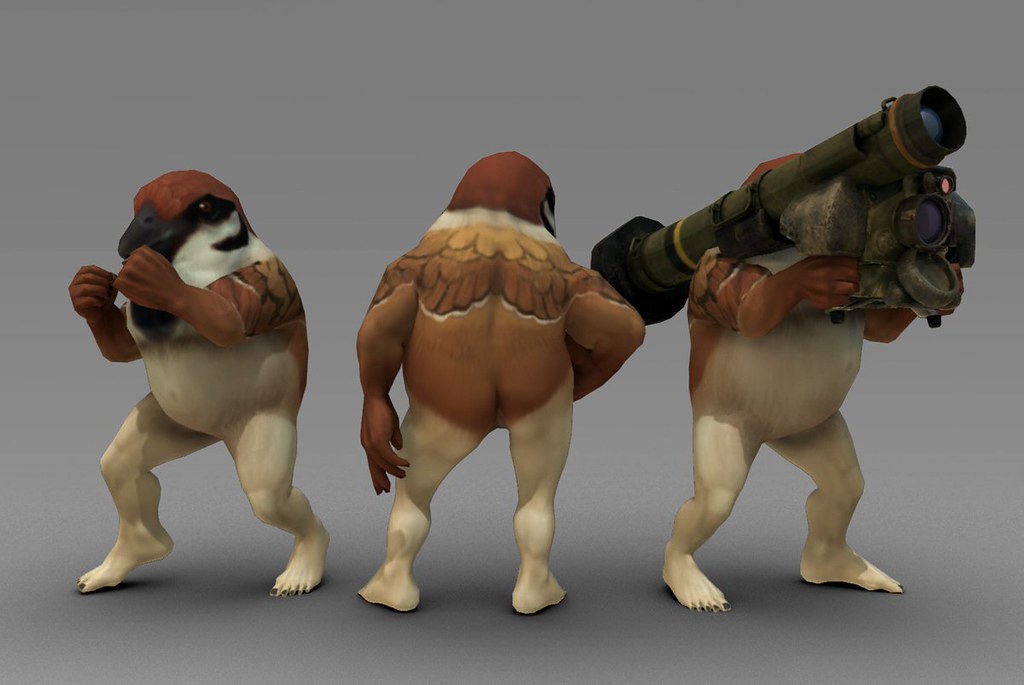 ▼ 在插畫中設計的戰鬥筋肉鳥,除了皆有強壯的肌肉以外還有各種煞氣的武器!
