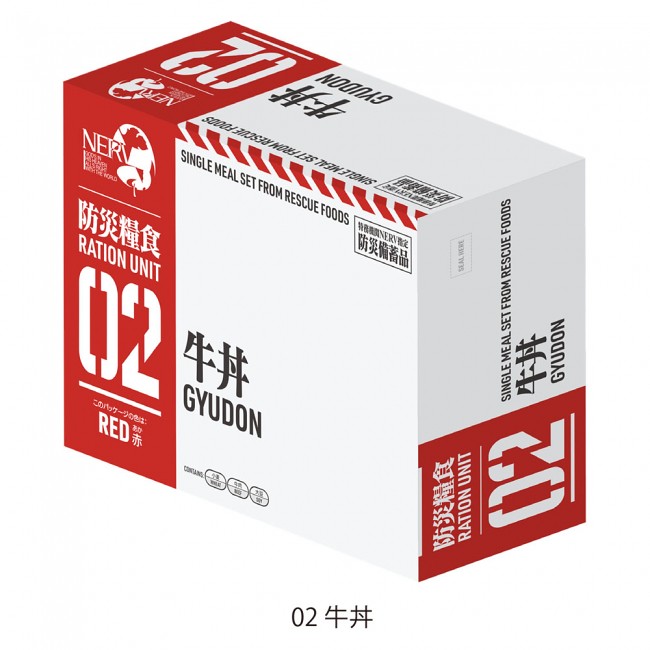「特務機關NERV 指定防災備蓄品」共有五種口味,分別為:咖哩牛肉、牛肉丼飯、燉牛肉、中華丼飯以及和風漢堡肉,每款包含 200g 的白飯與 180g 的醬料包,包裝使用 EVA 明朝體,並有警示條、NERV LOGO等設計,將防災糧食與 EVA 緊急事態的風格結合;除此之外,看起來好像也滿好吃的阿~