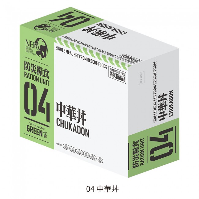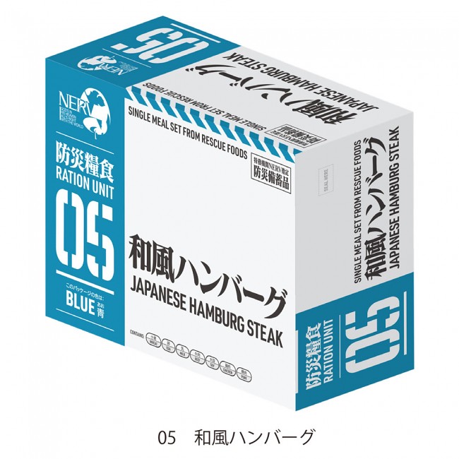 將自衛隊和災害現場使用的防災食品換上充滿 EVA 風格包裝的「特務機關NERV 指定防災備蓄品」,外盒紙箱印有「特務機關 NERV 指定」、第3新東京市(Tokyo-3)的字樣。內含五種經過特殊開發的防災食品,在發生災難時不需要加入水或使用火,打開後就可以直接食用,並有 3 年半的保存期限。