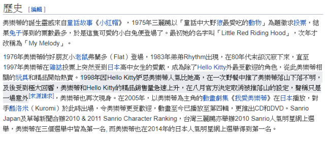 近期在臉書上熱議著一則有關於三麗鷗人氣角色「凱蒂貓 Hello Kitty」與「美樂蒂 Melody 」的話題,其內容是在維基百科上的介紹上寫著:「1998年因Hello Kitty妒忌美樂蒂人氣比她高,在一次野餐中推了美樂蒂落山下落不明,及後受到極大回響,美樂蒂和 Hello Kitty 的精品銷售量急速上升,在八月官方決定取消被推落山的設定,聲稱只是一場意外」