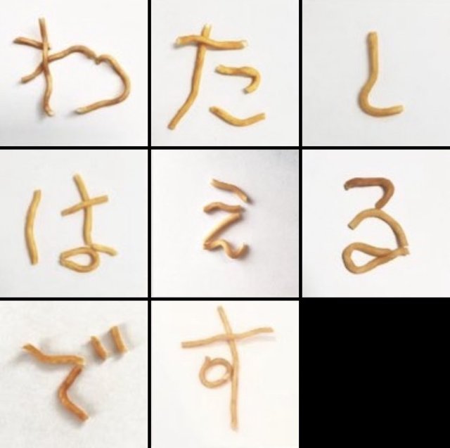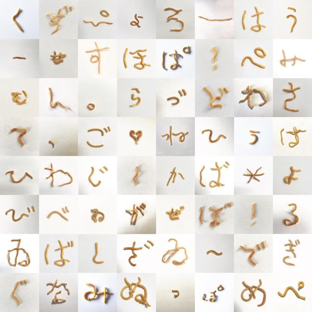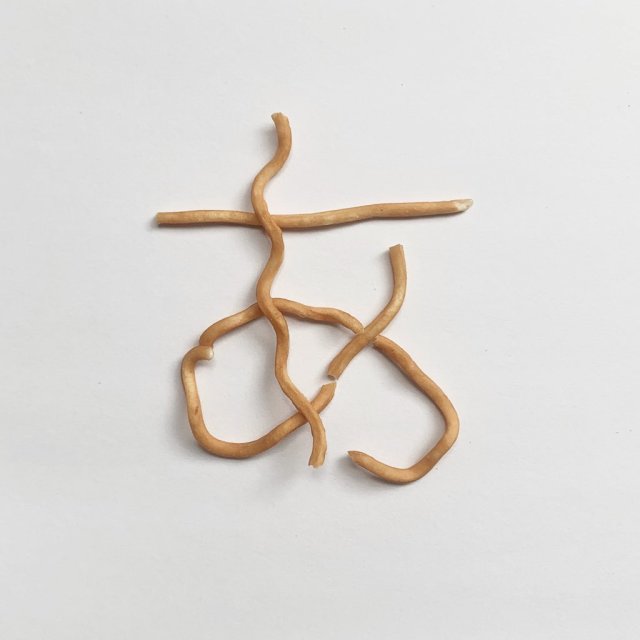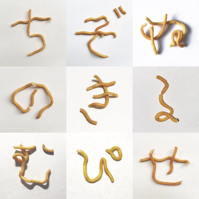 從照片可以看出這些都是日文五十音的平假名,但是並不是手寫或是牽線之類的,而是用點心麵接連成文字,教授也在推文這樣介紹他的「麵文字」:「不將點心麵視為『零食』而是『線』,透過將有機的形狀互相組合連接,做出充滿魅力的平假名◎ 」