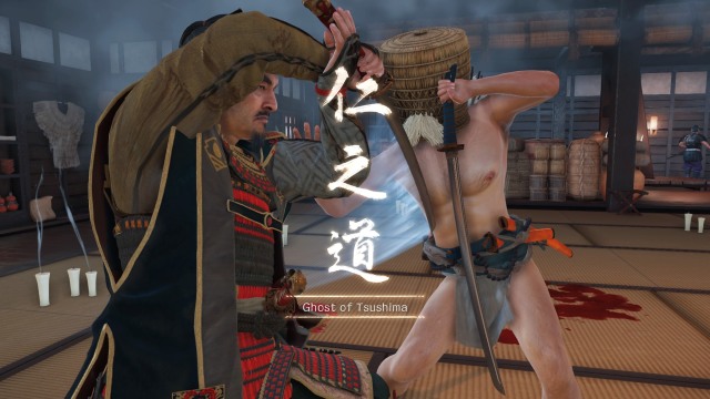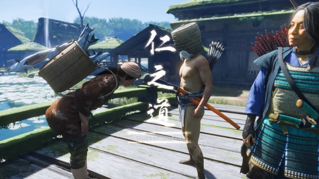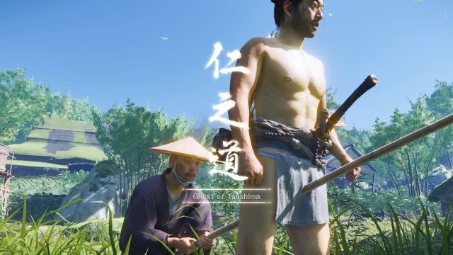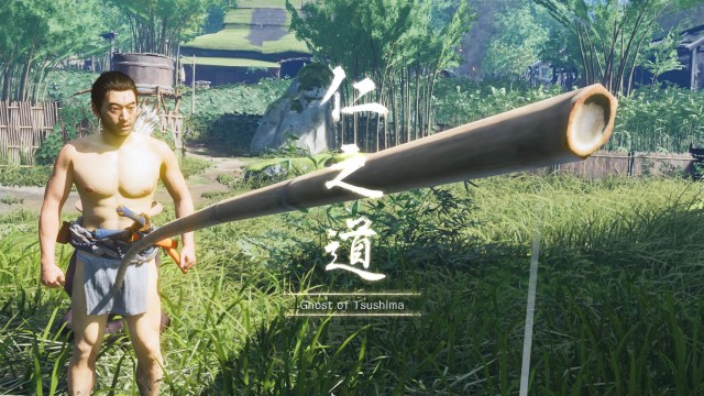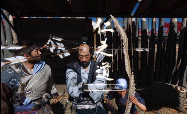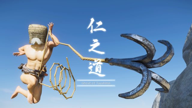 例如說善用開放世界中難免會有的 Bug 與破圖現象,將主角境井仁徹底玩壞,竹子明明就插在奇怪的位置上,連武士刀都已經砍進腦袋了,卻還一本正經的樣子實在是令人忍不住噴笑,再配上「仁之道」的白字標,讓整個畫面上的衝擊感變得超級強烈啊~~