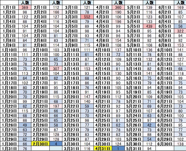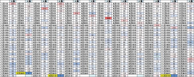 至於出生人數最少的日子是5月26日,只有42人,著名角色有《火影忍者》的海野伊魯卡和《銀魂》沖田總悟的姊姊三葉,第二少的是12月11日,只有43人。