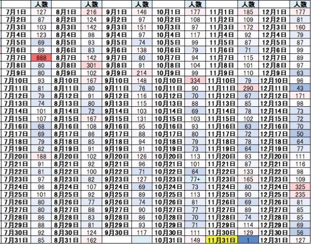首先,我們從表格上可以看到,月份和日的數字相同的那天出生人數比較多,並且奇數月奇數日的人數占多數,如1月1日、3月3日、5月5日等,其中又以7月7日多達888人的數量成為一年中生育率最高的一天。(誤)