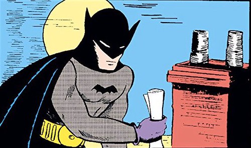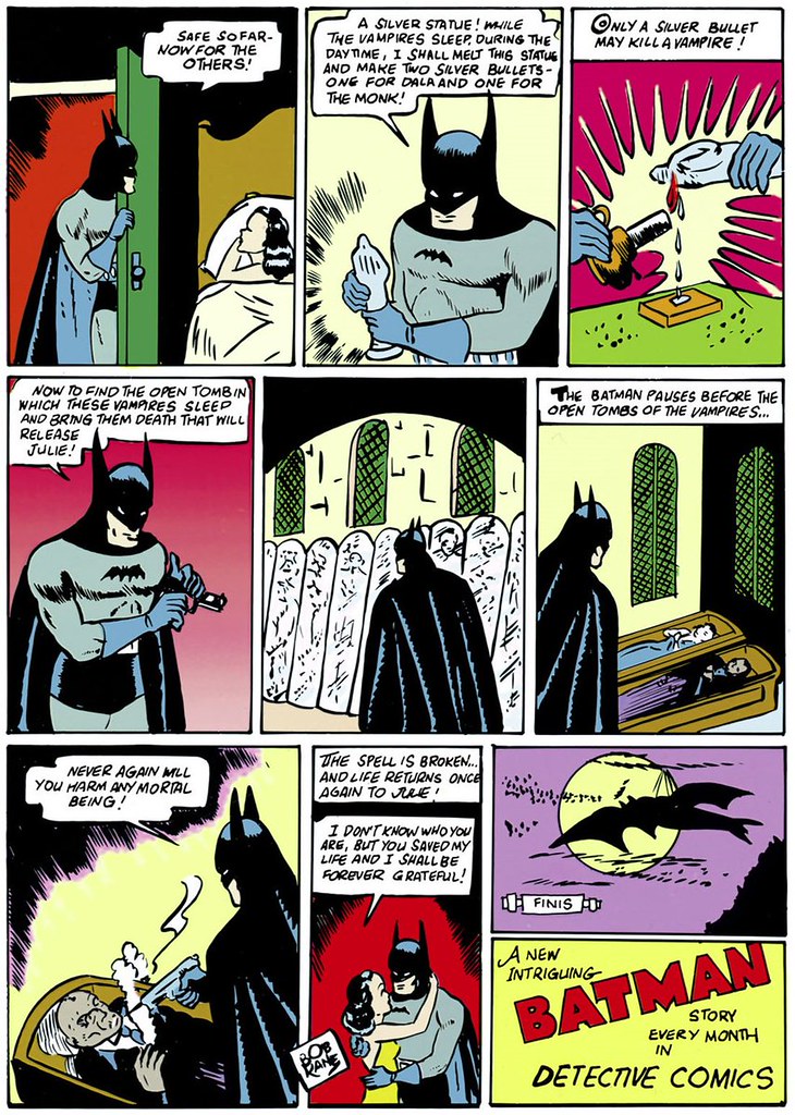 概念上這才是蝙蝠俠這個超級英雄人物出生的一刻。在此之前,他只是個不斷擺盪,四處摸索的不完整角色。在此之後,蝙蝠俠才真正成為那個痛恨槍、痛恨奪人性命的Gotham守護者。