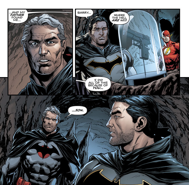 類似的做法也出現在Flashpoint閃點的平行宇宙故事線中:在那個平行宇宙中,被槍殺的是Bruce和媽媽,倖存的爸爸Thomas Wayne則變成蝙蝠俠,並將那把凶槍供奉在蝙蝠洞裡提醒自己。