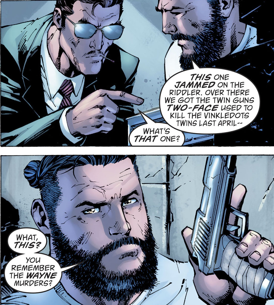 確認了這個「蝙蝠俠討厭槍」的設定之後,Bob Kane隨即在《Detective Comics》 第33期設計了整個蝙蝠俠宇宙最關鍵的事件:持槍歹徒在戲院旁的暗巷內當著Bruce Wayne的面射殺他的父母。