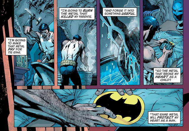 「這塊破銅爛鐵在我小的時候毀了我的人生。現在開始,同一塊破銅爛鐵將用來捍衛我作為一個人最要緊的心臟。這就是我眼中的正義!」蝙蝠俠說。