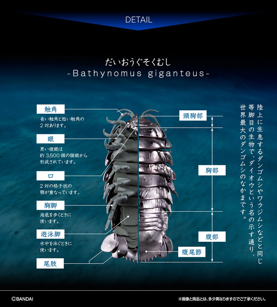 這次的主角是曾在第五彈登場的深海活化石「大王具足蟲」,大王具足蟲可以說是團子蟲的深海表親,也是世界上體積最大的等足目生物,體型可達 40 公分,巨大複眼的由 3500 個眼睛組成。據目前的研究資料,大王具足蟲早在一億六千萬年前便存在,主要棲息於 365~730 公尺深的海底土壤,以海洋生物的屍體為食,扮演著「海底清道夫」的角色,且能忍受超長期的飢餓。