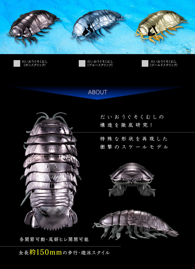 「金屬色大王具足蟲」延續先前推出的造型,以全長 15 公分大尺寸、可動規格製作,徹底考證再現觸角、複眼、口器、腳、尾肢等各個部位,各關節、尾肢為可動設計,而甲殼則分別採用有著高光澤的槍鐵、金屬藍、金黃色三種電鍍色塗裝,閃閃發亮質感超豪華!!