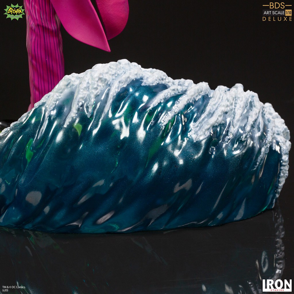 「BDS 小丑(1966 年經典電視劇版本)」高約 23 公分,捕捉了衝浪板上的小丑正以單腳站立的花式衝浪造型,頭雕部分傳神地再現演員「愷撒·羅摩洛(Cesar Romero)」的神韻與妝容,而桃紅色西裝外面套上一件綠色泳褲的裝扮更是一絕呀!衝浪板是以草綠色為主調,前端還印製了一個小丑的頭像,加上奔騰的海浪與浪花,真的十分令人懷念,一定要跟蝙蝠俠一起收藏啊。