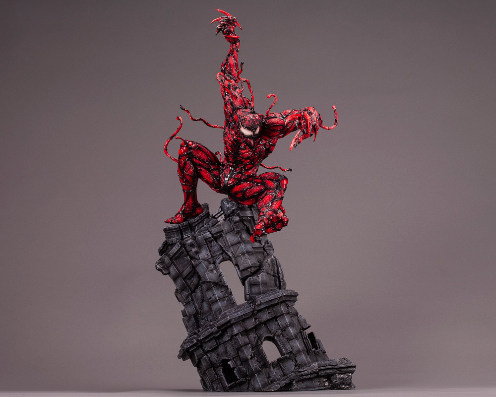 「Fine Art Statue 1/6 比例 MAXIMUM 屠殺」高約 60 公分,以他展開攻擊的樣貌設計,充分展現屠殺邪惡、殘暴的角色調性,被紅、黑主調共生體包覆的身軀刻畫出細緻的肌肉質感,巨大白眼的周圍還有血絲,除了在雙手位置已經形成銳利刀刃狀的共生體,本作還附上了五根觸手零件,可以變換不同的姿態來發動猛攻!地台則是以毀損的西式鐘樓為題打造,與猛毒搭配整個超讚。