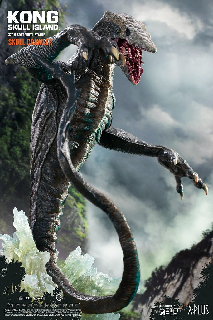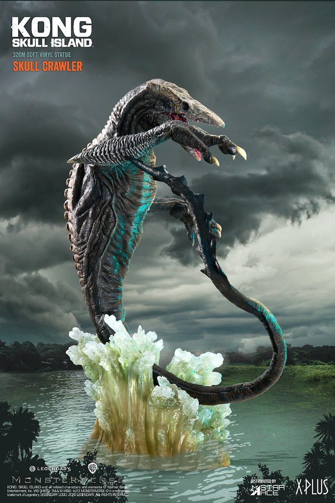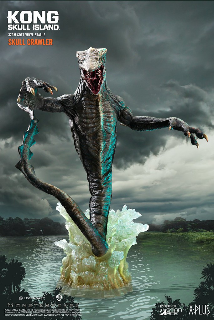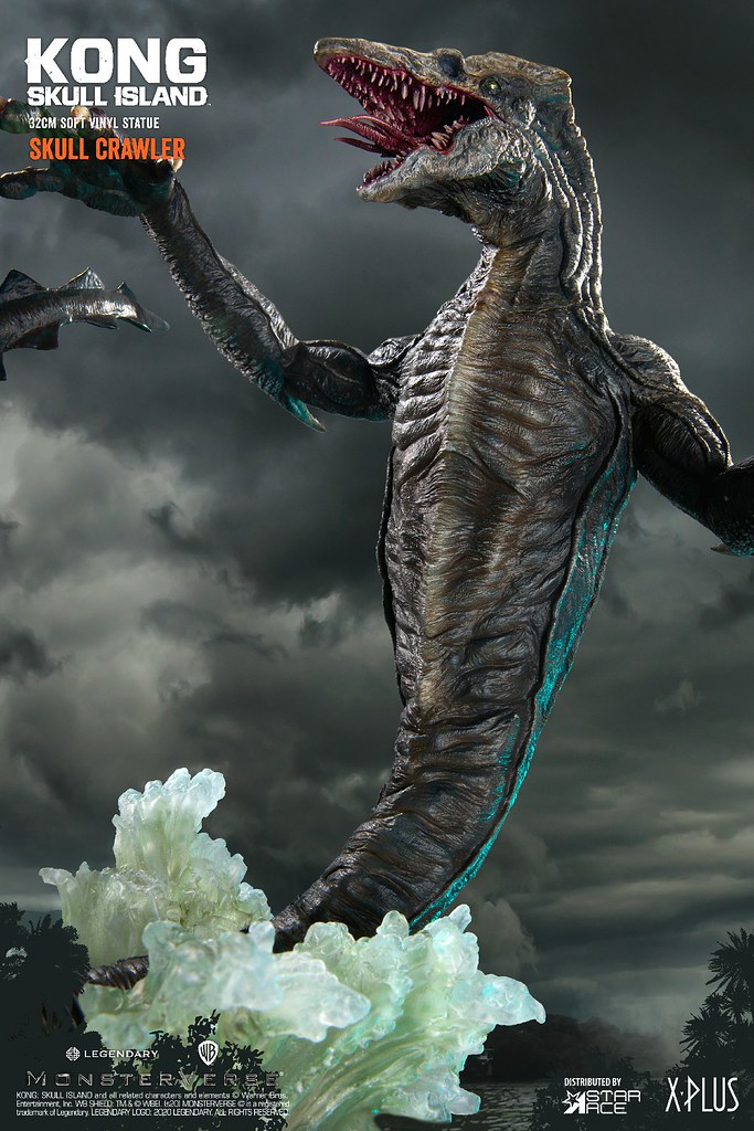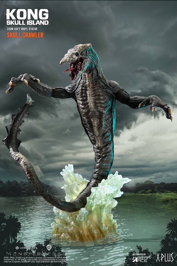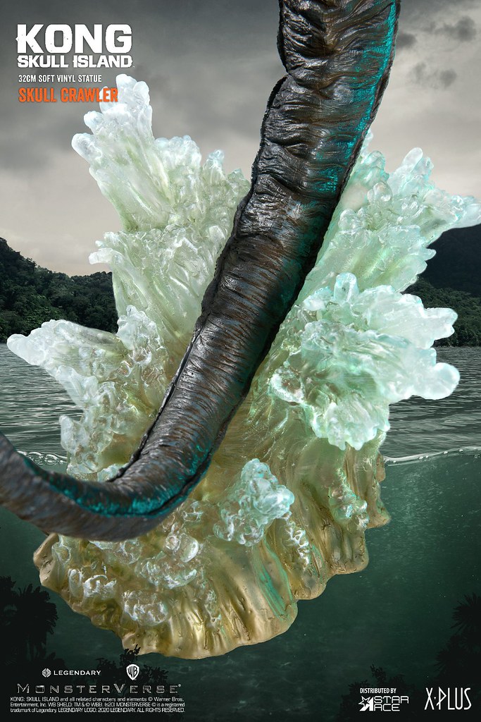 而這次的亮點是落在高度來到 35 公分,以軟膠、Polyresin 打造的「骷髏爬行怪」!異樣的頭部、舌頭,以及佈滿大口的利齒皆高度再現,利爪上還能看到斑斑血跡,長條狀軀體也刻畫出細緻的表皮皺褶與皮膚底下的骨骼形狀,為了表現骷髏爬行怪是從水面下突然竄起的情境,Star Ace Toys 選擇製作出一個水花濺起的地台來搭配,超讚!這邊也跟已經入手「金剛 2.0」的玩具人講一下,骷髏爬行怪是可以單獨購買的,不用再買一次當冤大頭~