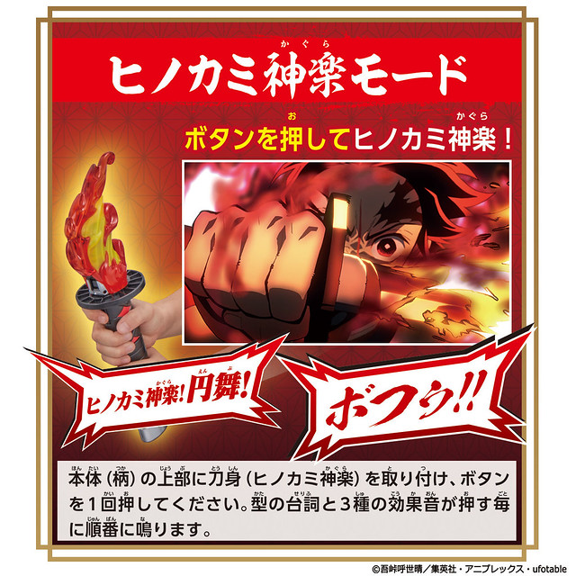 具備遊玩性與安全性的「DX日輪刀」由日輪刀柄、水之呼吸刀身、火之神神樂刀身三個零件構成,裝上水之呼吸刀身後長達 58 公分,在 DX 玩具中算是相當大型的尺寸。並且搭載了 50 種竈門炭治郎台詞音效、水之呼吸壹~拾之型音效,以及火之神神樂圓舞與其他在電視動畫版中出現的音效。