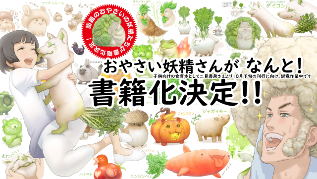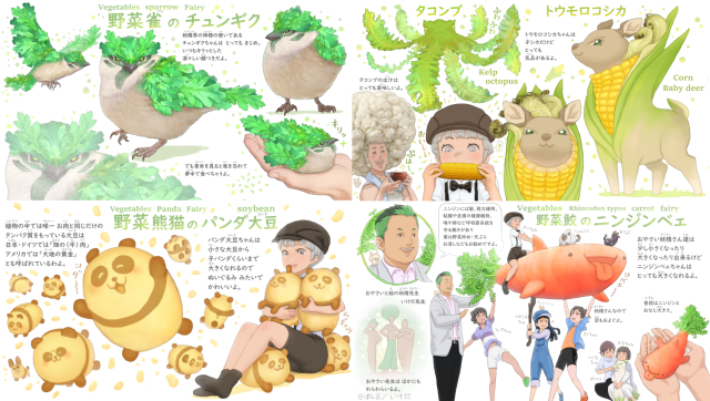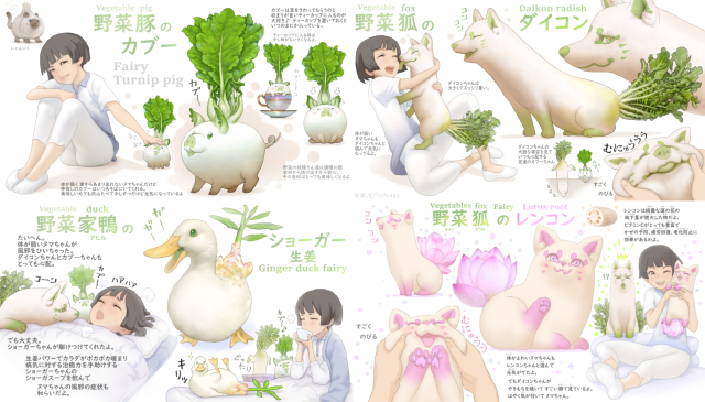 根據ぽん吉在推特上所發布的資訊,「野菜動物妖精」圖鑑預定在今年 10 月發行,其內容收錄了相當多動物與蔬菜的結合生物,例如在途中我們可以看到可愛柴犬與大白菜的結合、香菇與鼬,或是白蘿蔔小豬、玉米小鹿…等等。