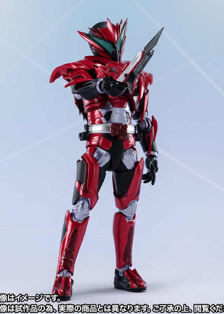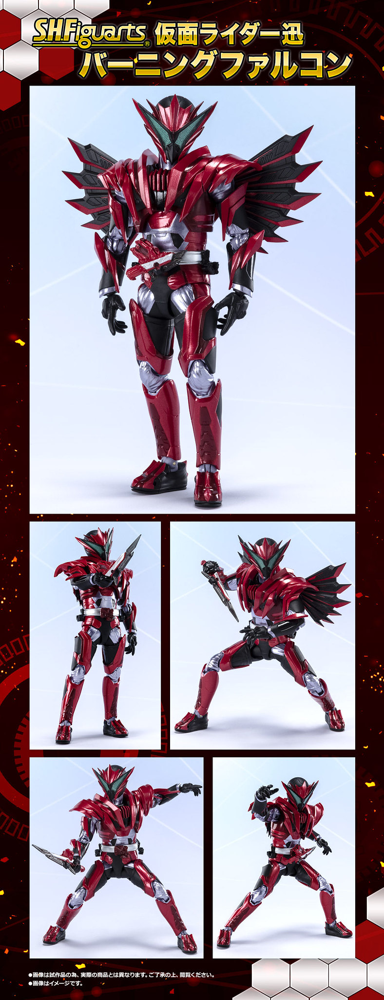 「S.H.Figuarts 假面騎士迅 燃燒獵隼」製作出全身特徵的銳利裝甲造型,並施以帶有珍珠光澤的鮮紅塗裝,背部雙翼重現細部刻線造型,並能透過替換零件方式再現展開.收納狀態。ZAIA 斬擊昇華器則收錄變身腰帶用的小型版,以及可拿在手中作為武器的大型版零件。