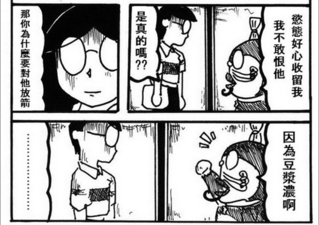 ▼還能活著也是奇蹟了... 而且在這部同人漫畫裡頭,大雄與哆啦A夢的立場完全反過來,更應該說,在這裡的哆啦A夢與哆啦美(哆啦魅),更是時常被性格暴躁的大雄虐待痛打。除此之外,劇中也時不時地塞進了當年台灣正紅的廣告詞哽或是影劇哽,例如先前提到的還珠格格惡搞、《黃易群俠傳》的廣告詞,以及當年統一陽光的豆漿廣告台詞等。