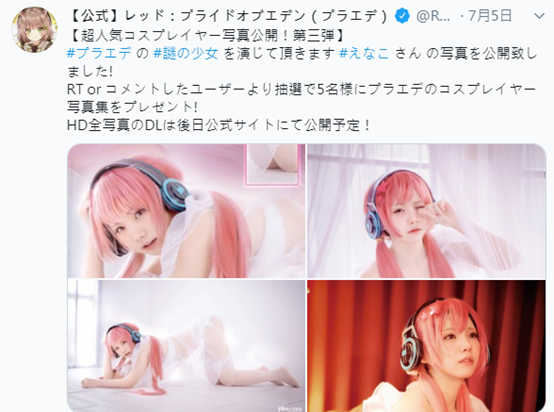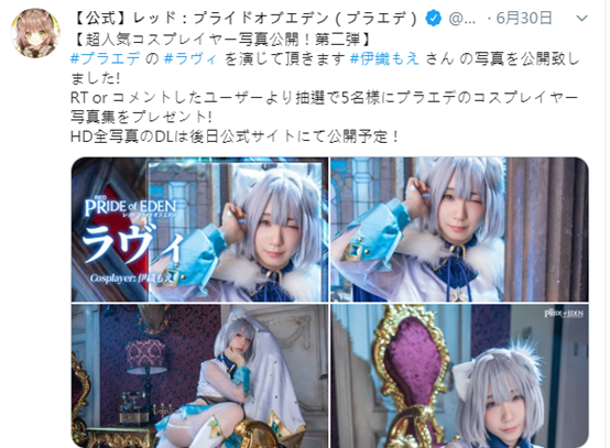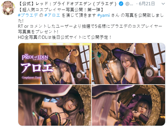 《レッド:プライドオブエデン》花了很長且大量的成本曝光,第一彈的アロエ由Yami扮演,第二彈的ラヴィ由伊織もえ還原;第三彈的謎の少女以えなこ曝光。