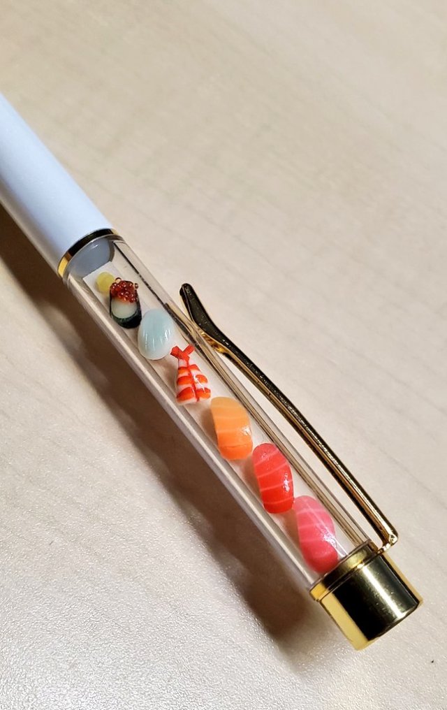 說到這,最近在網路上就有一款叫做「壽司筆」的原子筆,透明的筆桿裡放入了幾個看起來相當可口的幾道迷你壽司,小巧且精緻的袖珍壽司感覺十分逼真,彷彿就好像把真的食物放進筆桿裡面一樣,也因此這樣的文具設計受到了不少網友的注意,更是直呼好像寫著寫著肚子就會餓起來一樣。