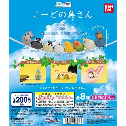 日本萬代公司轉蛋事業部「GASHAPON」旗下熱門的充電線保護套 Hugcot(ハグコッ)系列,繼好評的「小鳥充電線保護套」轉蛋後,又將推出第二彈「小鳥充電線保護套 2」轉蛋,第二彈一樣也是有八種款式,一轉200日圓,預計 2020 年 8 月第二週發售。