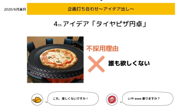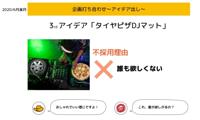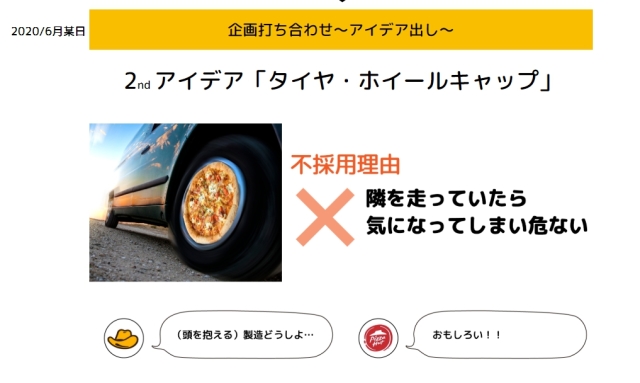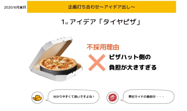例如說他們也曾想過製作一個輪胎造型的披薩,雖然聽起來很有意思,但這對必勝客來說幾乎是根本做不到的事情,負擔太大了,所以這個提案就放棄了。後來也提出了像是披薩造型的輪胎、披薩+輪胎的DJ轉盤等等…但基本上因為不切實際,最後還是回到「發音接近」這個點去構思。