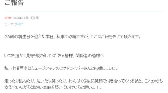 《I'm Enterprise》經紀公司旗下的聲優小澤亞李於8月10生日,同時於今天宣布與音樂家Hige Driver結婚喜訊。